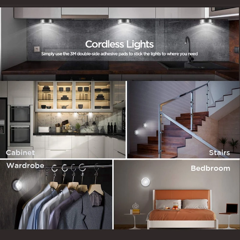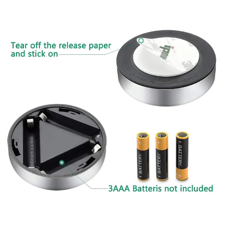چراغ اضطراری فشاری دارای 3 ال ای دی وبی نیاز از سیم کشی و استفاده از برق شهری است. چراغی کوچک و کم حجم که برای نصب در کابینت و انواع کمد، ماشین، حمام و کمپینگ مناسب است. بالا بودن ساعت عمر LED از دیگر مزایای استفاده از این چراغ است. برای استفاده فقط کافیست لایه نازک قسمت پشتی چراغ را جدا کنید و روی هر سطحی که مدنظرتان است بچسبانید. باتری ها به راحتی قابل تعویض هستند.