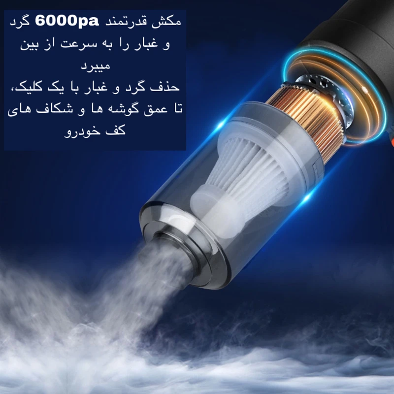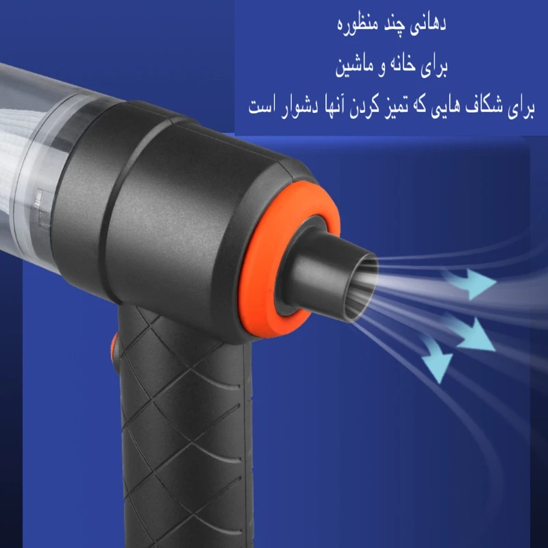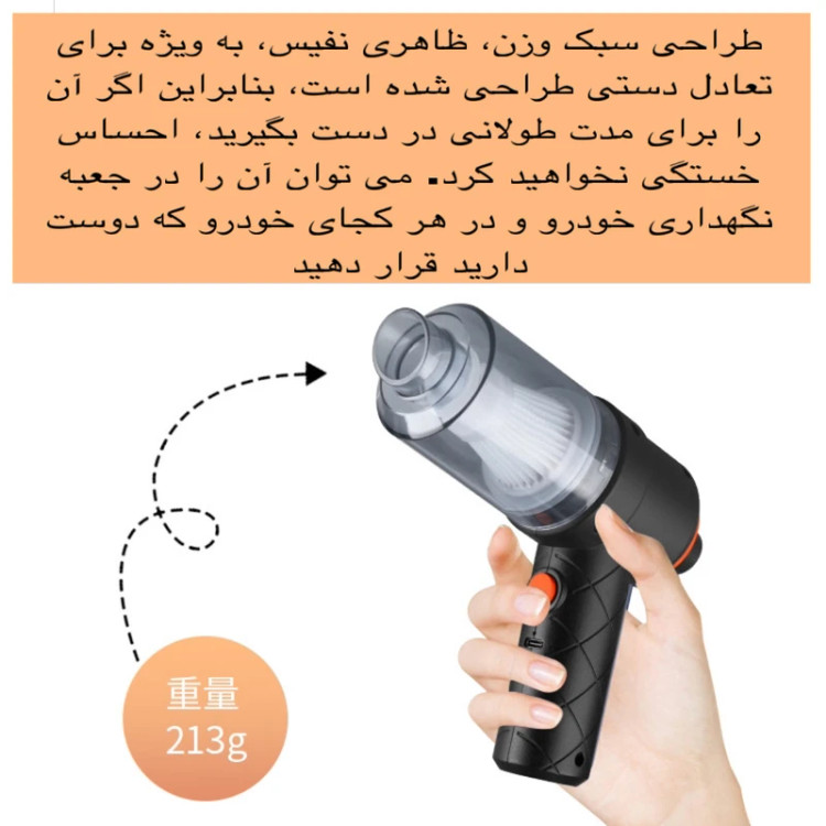 سایر توضیحات: موتور پر قدرت- دارای مکش و دمش دو منظوره- دارای فیلتر قابل شست وشو- مناسب برای تمیز کردن فضاهای باریک و عمیق/صندلی و مبل/صغحه کلید رایانه/جداره پنجره/کشو و کمد و غیره-